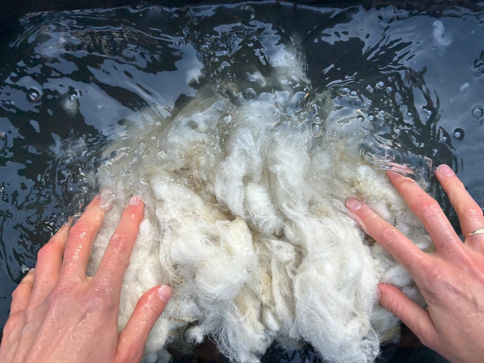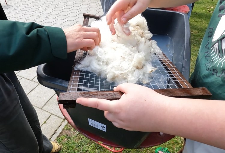 We beginnen bij de basis: het bekijken en voelen van onbewerkte wol. De deelnemers helpen mee met het wassen en drogen van de wol en ervaren hoe geur, structuur en zachtheid veranderen.