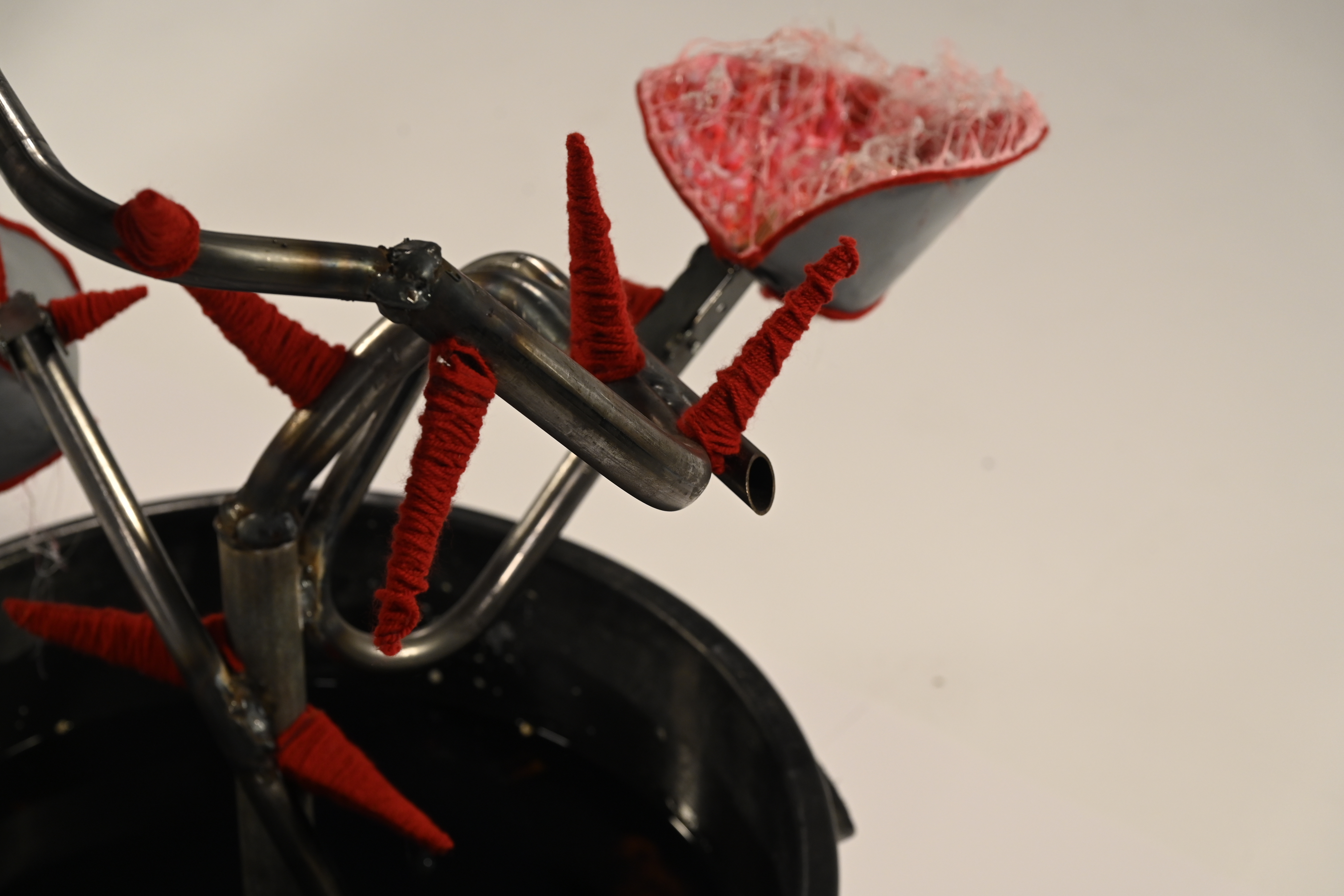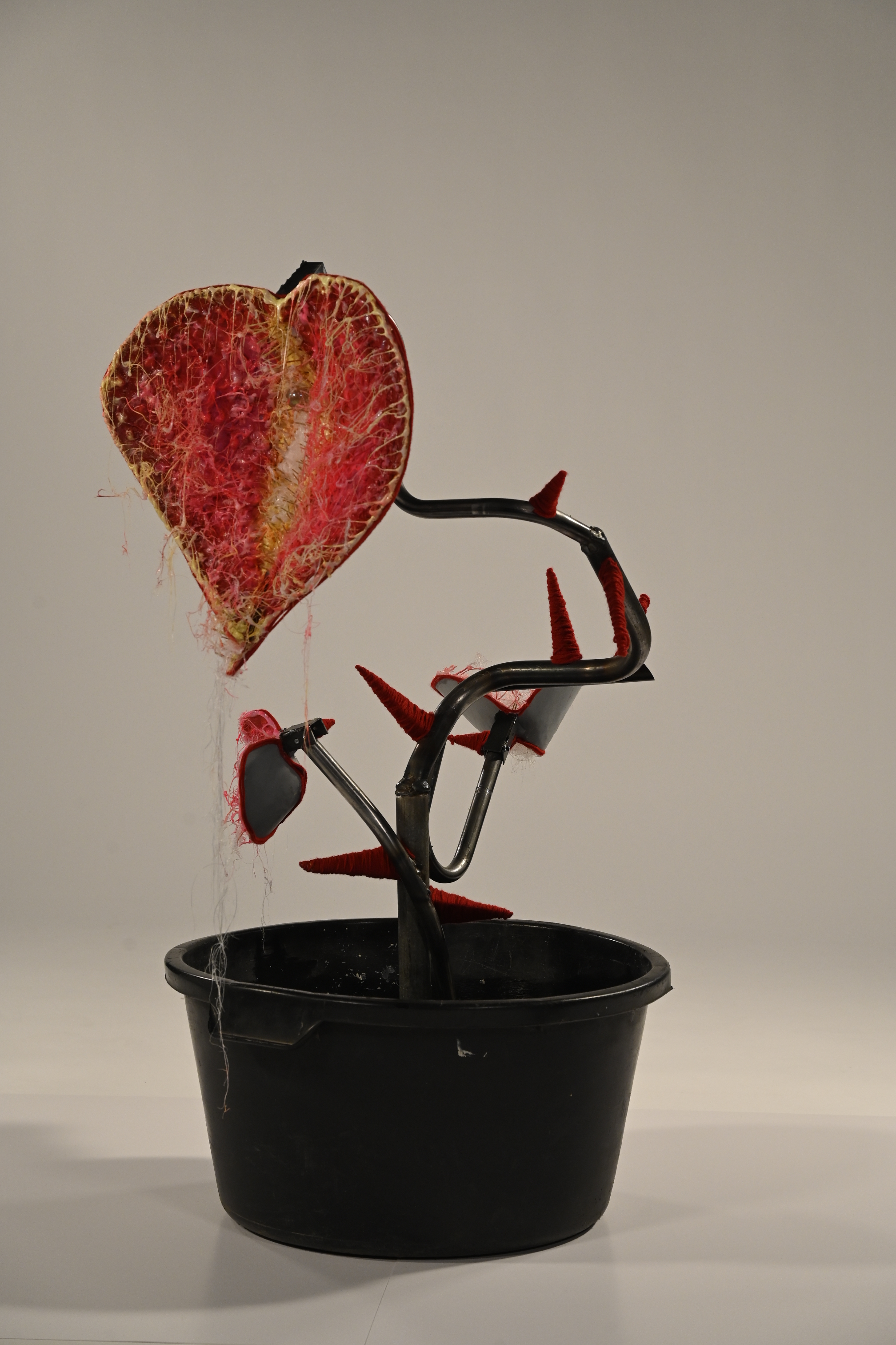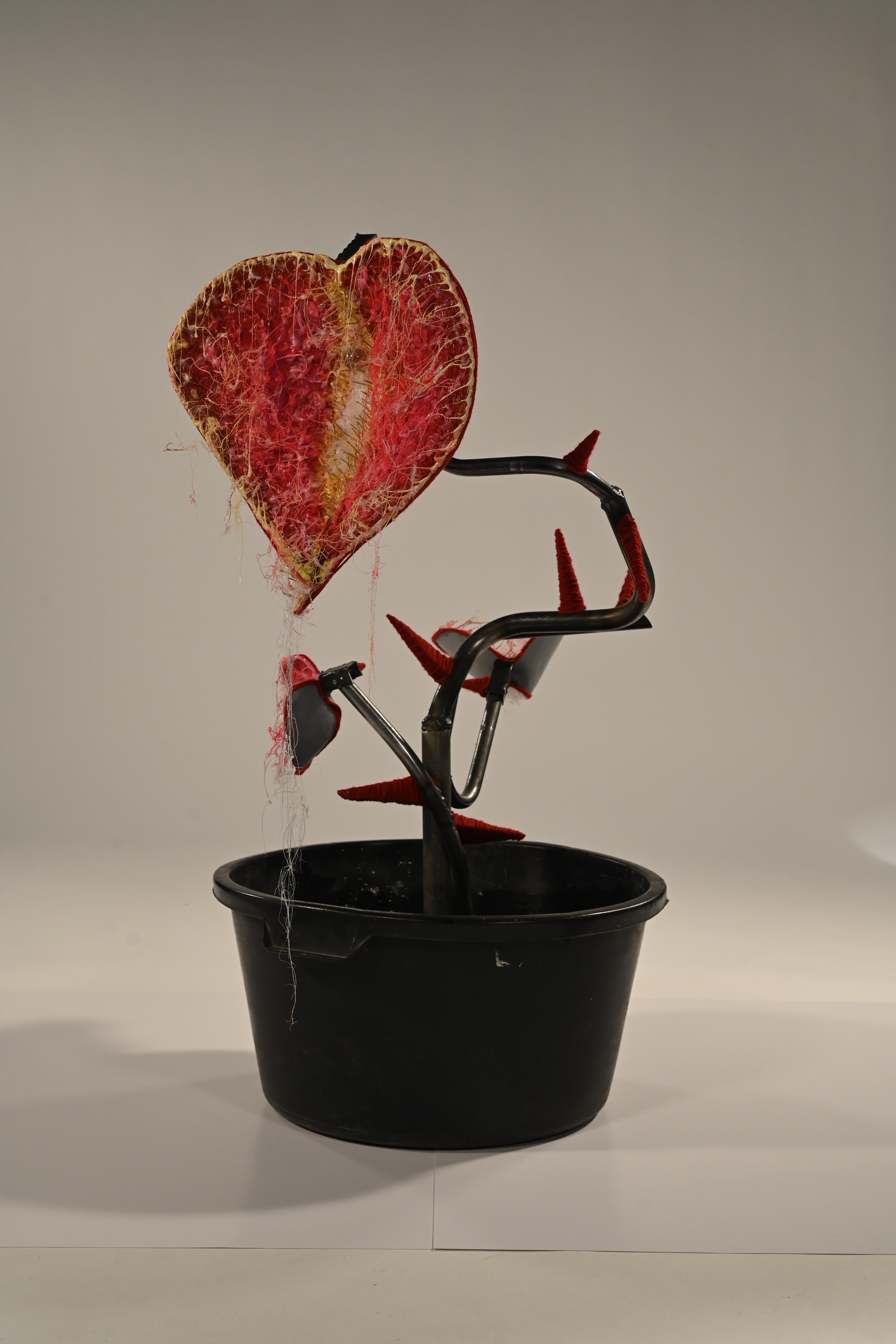 Gemaakt van metaal met grof laswerk straalt de stam kracht en ruwheid uit. Rode wollen doorns steken dreigend naar buiten, terwijl de bloemen, vulva-achtig van vorm, uitnodigen tot toenadering. In hun kern bevinden zich parels en spijkers: een combinatie van verleiding en gevaar. De wortels lijken te groeien uit zwarte olie—symbool voor het fossiele fundament van onze huidige destructieve systemen.