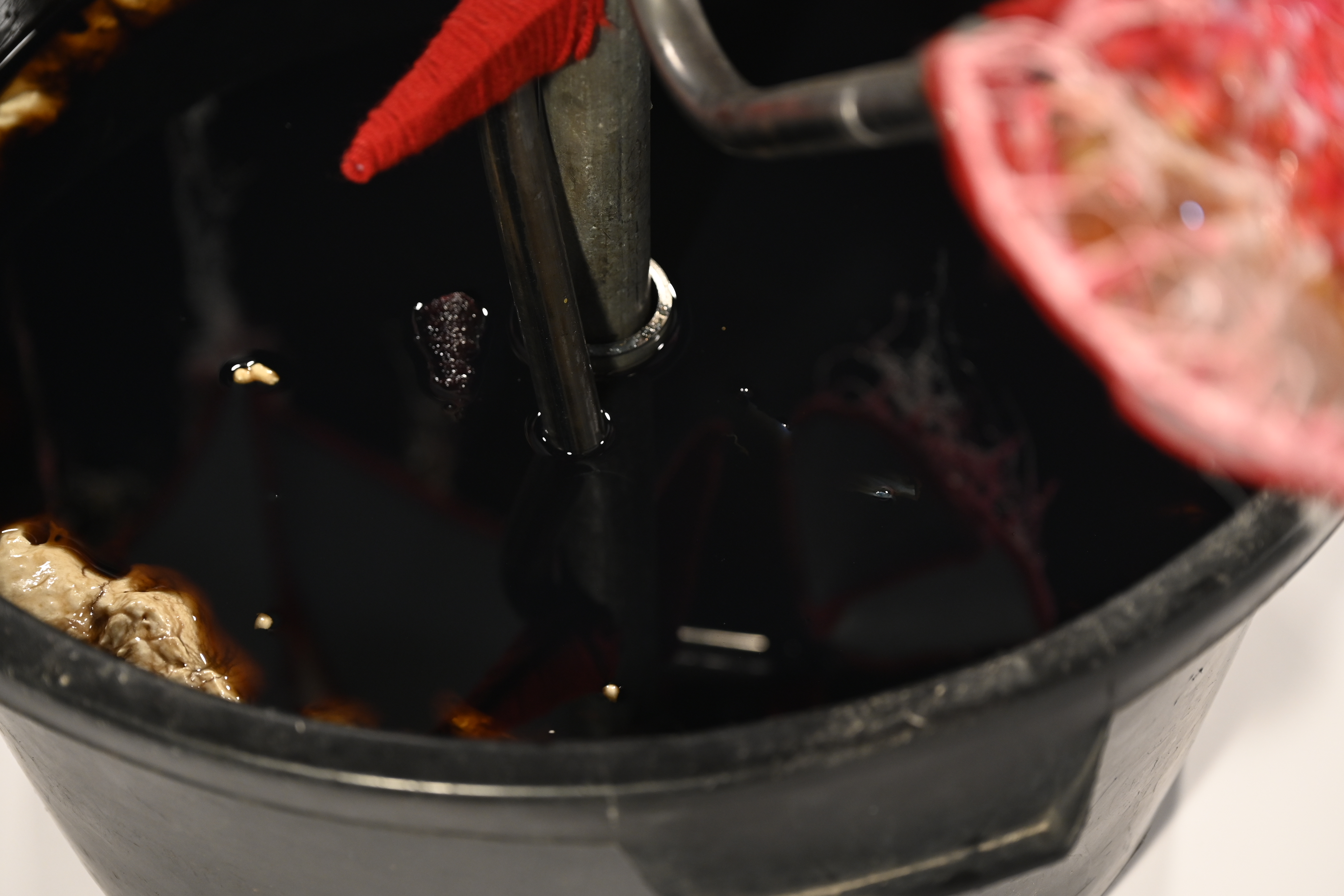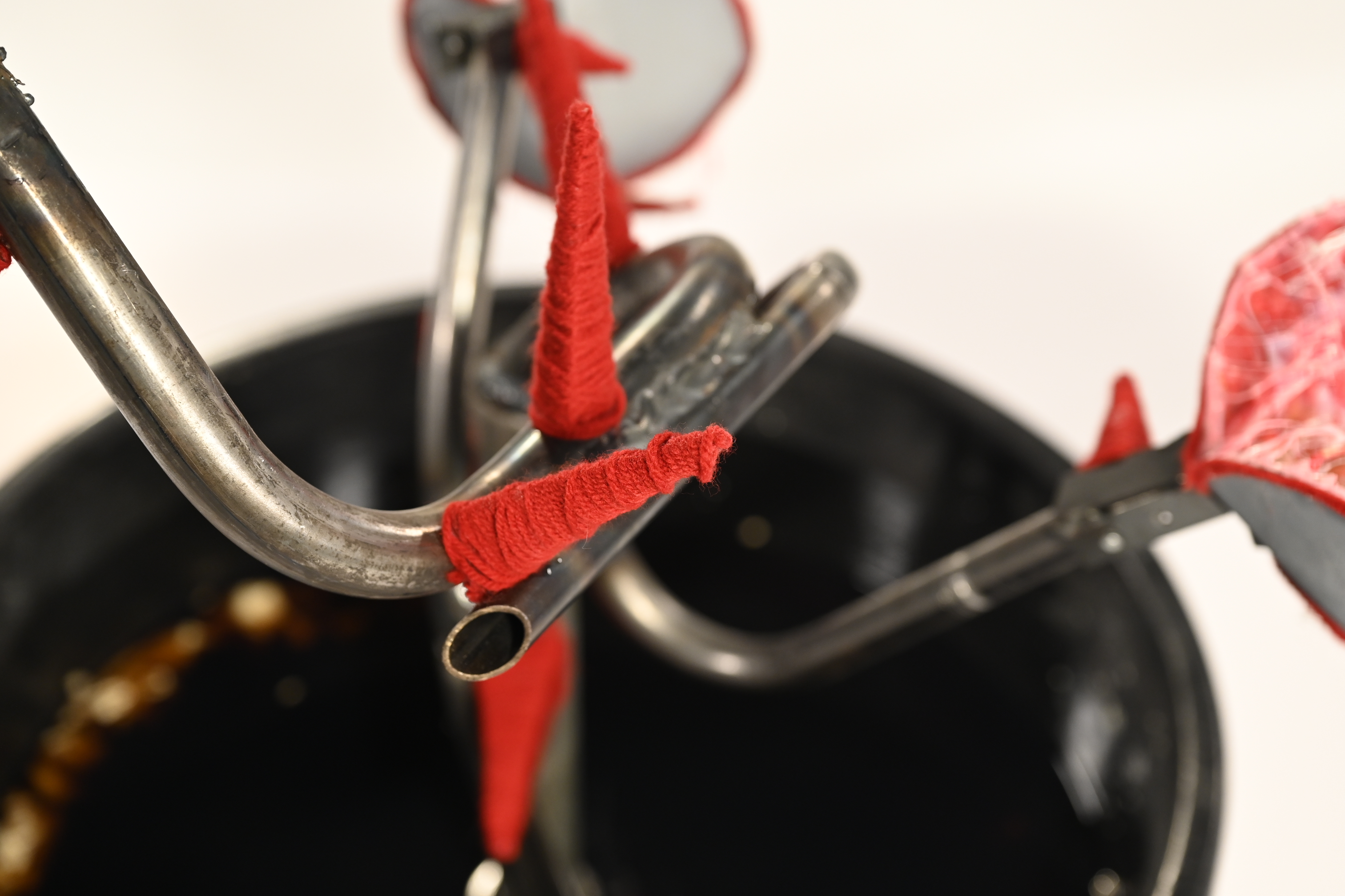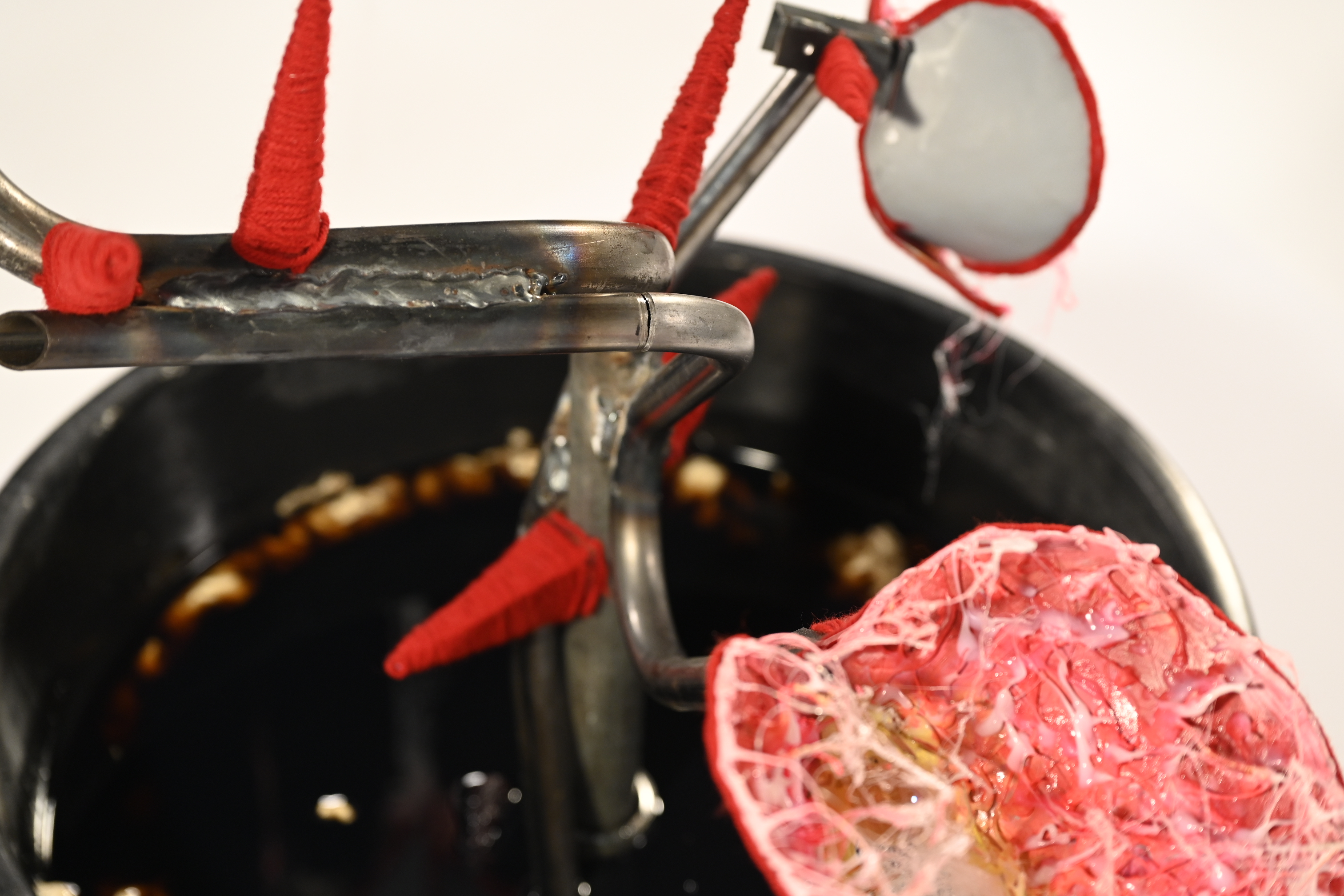Gemaakt van metaal met grof laswerk straalt de stam kracht en ruwheid uit. Rode wollen doorns steken dreigend naar buiten, terwijl de bloemen, vulva-achtig van vorm, uitnodigen tot toenadering. In hun kern bevinden zich parels en spijkers: een combinatie van verleiding en gevaar. De wortels lijken te groeien uit zwarte olie—symbool voor het fossiele fundament van onze huidige destructieve systemen.