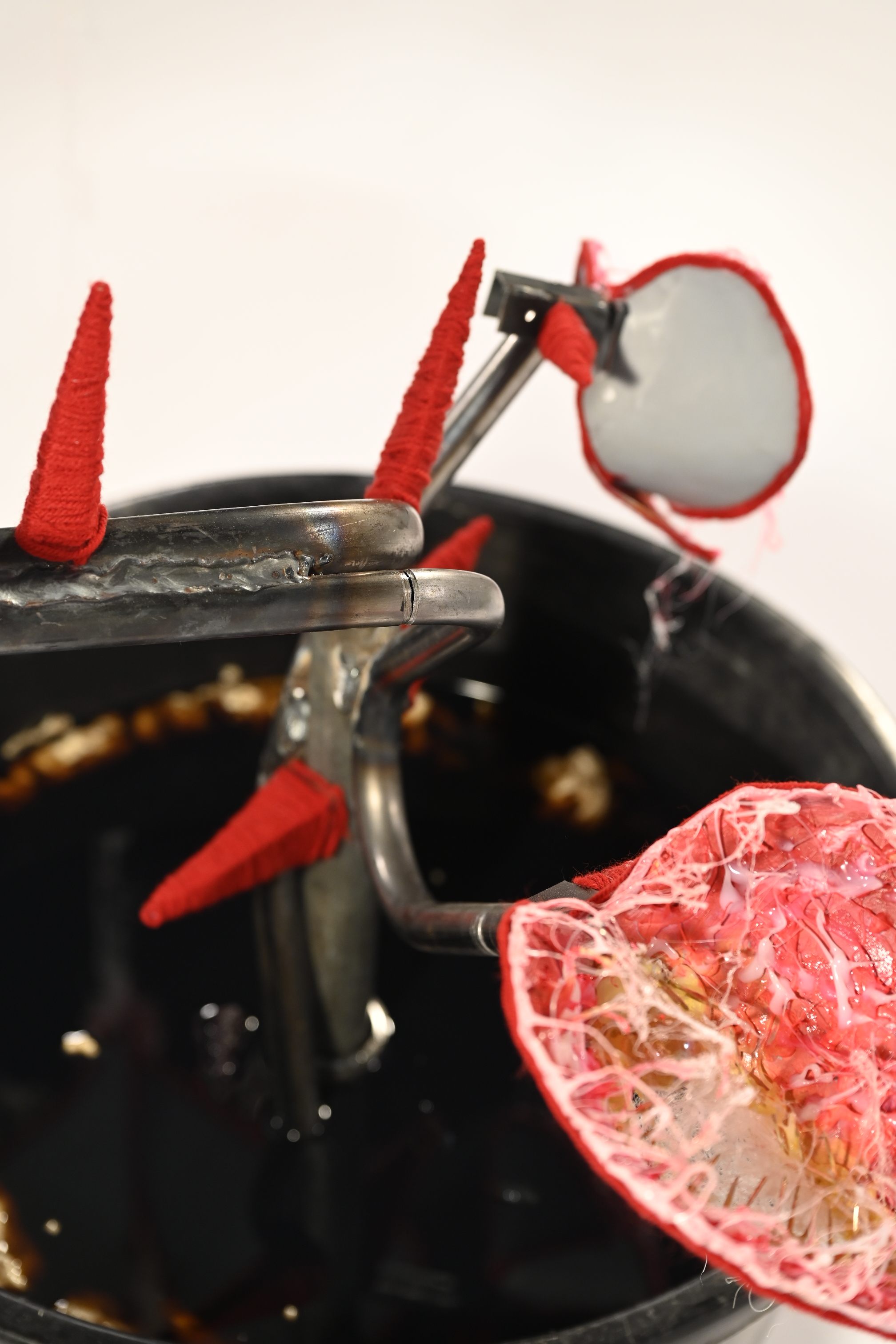 Mijn bijdrage werd een sculptuur van een geëvolueerde, vleesetende plant—een fictieve soort die is ontstaan uit generatieslange uitbuiting door de mens. Ze groeit uit olie, draagt een huid van grof gelast metaal en rode wollen doorns, en lokt met bloemen vol parels en spijkers. Het werk is zowel verleiding als valstrik: een natuur die zichzelf heeft bewapend om zich te beschermen tegen menselijke hebzucht.